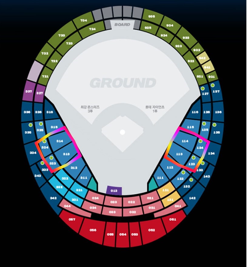 사직구장의 좌석 배치도를 봤을 때 사진에서 무지개빛 네모 부분이 응원단상과 가까운 곳입니다. 홈팀 113 114 구역 앞에 응원단상이 있고 원정팀 313 314 구역 앞에 응원단상이 있습니다. 그래서 응원석으로 113 114 혹은 313 314 구역을 선택하기 쉬운데 응원하기 좋은 좌석은 따로 있습니다.