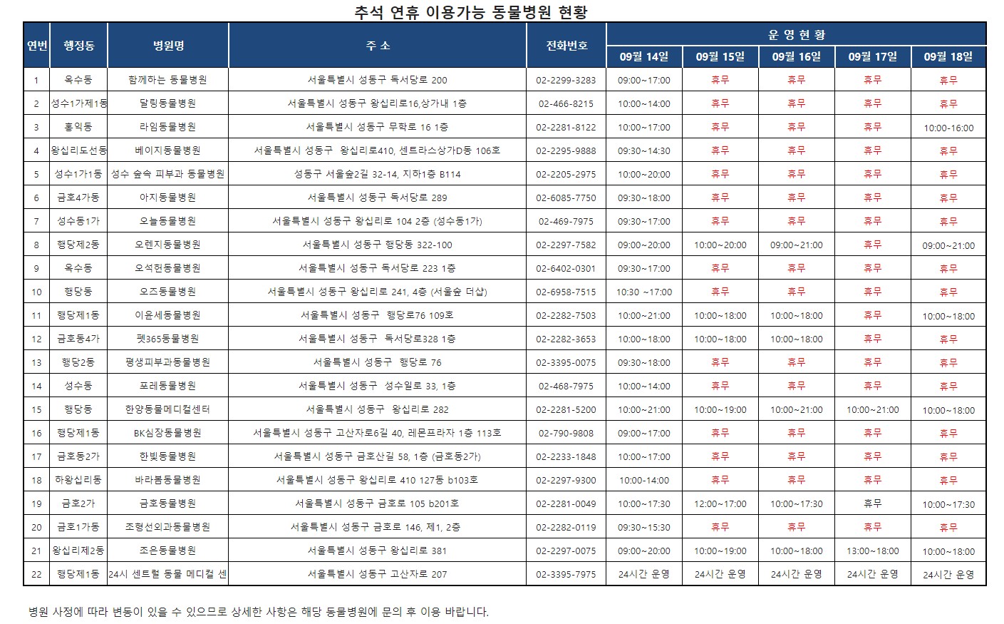 서울 성동구 추석 연휴 진료 가능 동물병원
